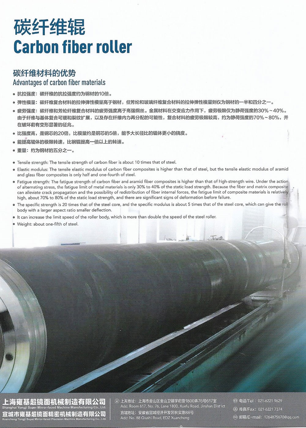 ●比強度高,是鋼芯的20倍,比模量約是鋼芯的5倍,能予大長徑比的輥體更小的撓度。